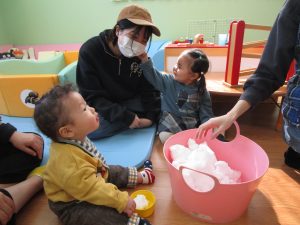 今日は冬を楽しもうということで、桶に雪を入れてミニ雪遊びをしました。桶から小さいカップに雪を移すと、ちょんと触れてみたり、遠くから眺めてみたりと様々な姿を見せてくれました!またお母さん達同士の会話が、盛り上がり楽しんでいる姿に、こちらも嬉しくなりました♪