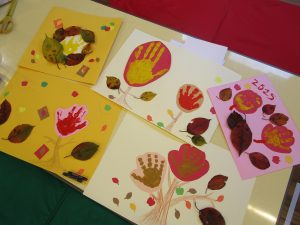 赤や黄色に色づいた落ち葉を使った制作を行いました。親子でスキンシップを取りながら手の平に絵の具を塗って“ペッタン!” 小さな可愛らしい手形を落ち葉や木々にみたてて、ママ達のアイディアいっぱいの秋らしい作品ができあがりました。