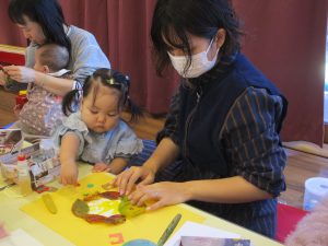 赤や黄色に色づいた落ち葉を使った制作を行いました。親子でスキンシップを取りながら手の平に絵の具を塗って“ペッタン!” 小さな可愛らしい手形を落ち葉や木々にみたてて、ママ達のアイディアいっぱいの秋らしい作品ができあがりました。