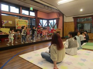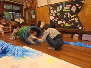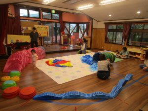 先日行われた保育園の運動会から、今日はサークルでも運動会ごっこを楽しみました。3歳児めろん組さんのダンス披露からスタートし、様々なコーナーで体をたっぷりと動かして遊びました。ハイハイやつかまり立ち、歩くことが上手になってきたお子さんがいっぱいです♪