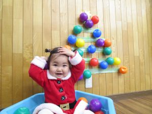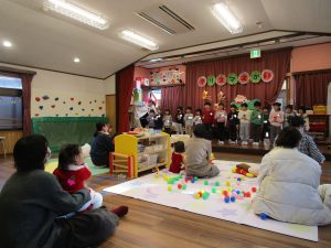 今日は、楽しいクリスマスday。子ども達の洋服も、可愛らしいクリスマスカラーに染まっていました。手遊び「とんとんひげじいさん(クリスマスバージョン)」を楽しんだり、5歳児すいか組さんによるハンドベル「星に願いを」の素敵な音色の演奏を聞いたりと、みんなでクリスマスの雰囲気を味わいました♪
